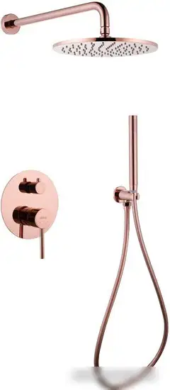 Душевая система Abber Wasser Kreis AF8118RG в розовом золоте создает комфорт и стиль в вашей ванной комнате. Она включает верхний круглый душ диаметром 250 мм, который легко крепится на шарнире и обеспечивает равномерное распределение воды. В комплект входит ручной душ с одним режимом работы, который можно зафиксировать в удобном положении. Монтаж осуществляется настенным способом с скрытой установкой, что делает внешний вид аккуратным и современным. В системе есть механический смеситель/вентиль, который точно регулирует температуру и давление воды. Верхний душ выведен на вылет 400 мм, что обеспечивает свободное пространство под ним. Вся конструкция компактная и функциональная, подходит для современных интерьеров. Благодаря простоте использования и качественным материалам, эта система долговечна и надежна. Устройство легко управляется и обеспечивает полноценный комфорт во время душа.