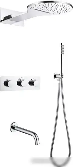 | Комплектация | верхний душ, ручной душ (лейка), держатель лейки, шланг, смеситель, излив для ванны |
