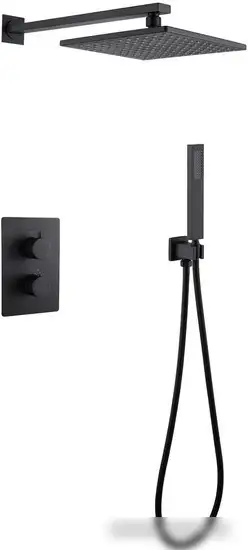 Душевая система Abber Weiss Insel AF8051B в черном матовом цвете отлично подойдет для современного туалета. Она состоит из верхнего и ручного душа, что обеспечивает комфортное использование и возможность выбрать удобный режим. Верхний душ имеет диаметр 250 мм и висит на шарнире, его можно регулировать для удобства. Ручной душ прямоугольной формы имеет один режим работы и небольшой диаметр 35 мм, что удобно для мытья. В системе установлен термостатический смеситель, который помогает поддерживать постоянную температуру воды. Вся конструкция монтируется на стену, а в комплект входит шланг и держатель для лейки.