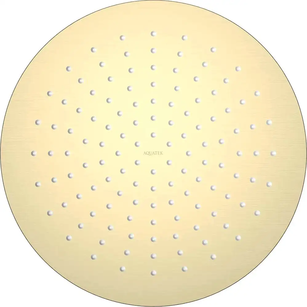Верхний душ Aquatek AQ2075BG выполнен из качественной нержавеющей стали в золотом цвете. Он устанавливается на потолок и имеет фиксированный круглый лейку диаметром 300 мм, обеспечивая равномерное распределение воды. Одним режимом обеспечивает комфортное и приятное купание. Простая монтажная конструкция позволяет легко установить душ без смесителя или вентиля. Вес устройства составляет всего 1,4 кг, что облегчает его монтаж и эксплуатацию. Верхний душ обладает прочной конструкцией и эстетичным внешним видом. Он не включает ручной душ, что упрощает выбор и использование. За счёт большого диаметра создаётся широкий поток воды, что способствует комфорту. Этот душ легко интегрируется в современную ванную комнату, придавая ей стильный вид и удобство. Благодаря аккуратной форме и качественным материалам, он долго прослужит и сохранит внешний вид.