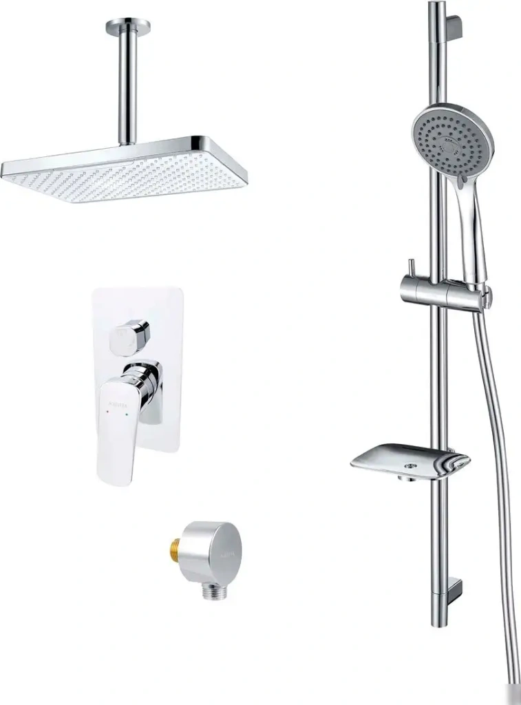 | Комплектация | верхний душ, ручной душ (лейка), держатель лейки, шланг, смеситель, мыльница или держатель для мыла |