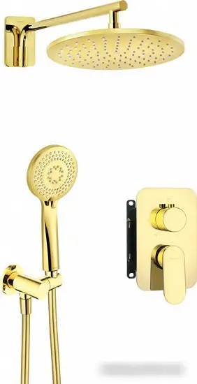 Душевая система Deante Alpinia BXYZZGAM сочетает стильный дизайн с практичностью. Она включает в себя верхний и ручной душ, оба круглой формы, что легко сочетается с различными видами интерьера. Верхний душ имеет один режим и диаметр 250 мм, создавая широкий поток воды. Ручной душ обеспечивает три режима для комфортного использования и легко фиксируется держателем. Вся система выполнена из латуни и имеет скрытую монтажную конструкцию, что делает её визуально аккуратной. В комплектацию входят шланг, смеситель и вентиль, что упрощает установку и эксплуатацию. Цвет изделия — золотистый, он добавит роскоши в ванную комнату. Вылет верхнего душа составляет 400 мм, что обеспечивает удобство использования. Эта система подходит для тех, кто ценит комфорт и стиль в ванной. Благодаря механическому смесителю управление остается простым и надежным.