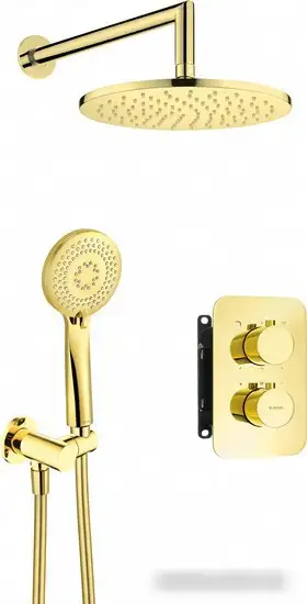 Душевая система Deante Box Gold BXYZGEBT создаёт комфортную и современную атмосферу в вашей ванной комнате. Она выполнена из прочного латуня и имеет стильный золотистый цвет, который подчеркнёт дизайн любого интерьера. Система включает верхний душ диаметром 250 мм с одним режимом, и ручной душ диаметром 100 мм, что позволяет легко менять поток воды. Верхний душ расположен на вылете 400 мм, а шланг длиной 1,5 м обеспечивает свободу движений во время душа. Благодаря механическому смесителю и скрытому монтажу устройство легко устанавливается и служит долго. В комплект входит держатель для лейки и всё необходимое для установки. Эта система не ограничивает расход воды и температуру, что дает дополнительный комфорт и экономию.