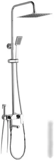 Душевая система FRAP F2419 выполнена из прочного металла и имеет стильный хромированный цвет. Она устанавливается на стену и занимает немного места. В системе есть верхний душ с прямоугольной формой и диаметром 250 мм, который можно регулировать по углу. Также есть ручной душ с регулировкой по высоте и гигиенической лейкой для большего комфорта. На смесителе установлен механический переключатель режимов, что делает управление простым и удобным. Общая длина системы составляет 1350 мм, что идеально подходит для стандартных ванных комнат. Возможности системы включают один режим работы верхнего и ручного душа, без дополнительных функций, таких как гидромассаж или освещение. Конструкция не ограничивает расход воды, что позволяет экономить и контролировать использование. Это надежное и стильное устройство подходит для ежедневного использования и легко устанавливается.