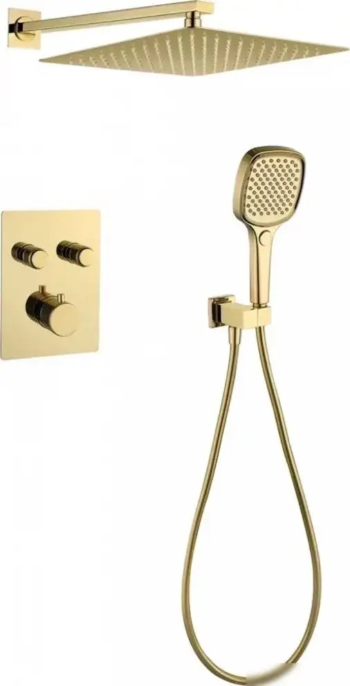 Душевая система Grocenberg GB5040 выполнена в элегантном золотом глянце и украшена стильной прямоугольной формой. Она состоит из верхнего и ручного душа, оба с по три режима распыления, что позволяет выбрать наиболее комфортный поток воды. Верхний душ диаметром 300 мм фиксируется в строгом стиле, а ручной душ диаметром 120 мм удобно держится и легко управляется. Все компоненты сделаны из прочных материалов: латунь и металл, что обеспечивает долговечность. Монтаж осуществляется скрытым способом для аккуратного вида. В конструкции установлен термостатический смеситель, который регулирует и ограничивает температуру для безопасной и комфортной эксплуатации. Шланг длиной 1,5 метра гибко подходит к любой ванной зоне. Вес системы – 6 кг, что делает её устойчивой и надежной.