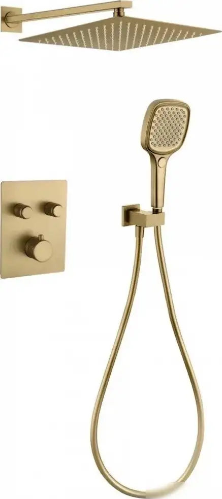 Душевая система Grocenberg GB5040 сочетает стильный золотой матовый цвет и современную конструкцию. Она имеет скрытую установку, что делает интерьер аккуратным и простым в уходе. В системе есть верхний и ручной души, каждый из которых можно выбрать из трёх режимов. Верхний душ имеет прямоугольную форму и размер 300 мм, а ручной — 120 мм, оба фиксированные и легко регулируются. Термостатический смеситель обеспечивает стабильную температуру воды, уменьшая риск ожогов. Шланг длиной 1500 мм позволяет комфортно пользоваться душем. Благодаря материалам из латуни и металла корпус системы прослужит долго и устойчив к повреждениям. В комплект входит всё необходимое для быстрой установки и использования. Эта система делает процесс душа приятным, удобным и безопасным.