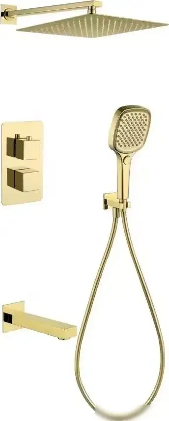 Душевая система Grocenberg GB5050 с термостатом украшена в стильном золотом глянце и подходит для современного интерьера. Она оснащена верхним и ручным душем, оба имеют по три режима для комфортного выбора воды. Верхний душ имеет прямоугольную форму с диаметром 300 мм, а ручной — 120 мм, оба фиксированные и удобные в использовании. Термостат обеспечивает стабильность температуры воды, что предотвращает резкие перепады и повышает безопасность. Монтаж осуществляется скрытым способом, что делает внешний вид более аккуратным. В комплекте есть держатель для лейки и шланг длиной 1500 мм для свободного перемещения. Изготовлена из прочных материалов — латунь и металл — для долговечности и устойчивости к коррозии. Вес системы — 6 кг, что удобно при установке. Обратный клапан и ограничитель температуры повышают безопасность и удобство эксплуатации.