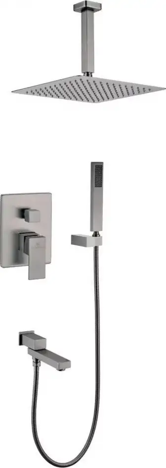 Душевая система Grocenberg GB5089BG-2 в графитовом цвете отлично заменит старую душевую. Она включает верхний и ручной душ для комфортного использования. Верхний душ имеет диаметр 300 мм и фиксируется в один режим, обеспечивая равномерное распыление воды. Ручной душ диаметром 35 мм позволяет легко мыться и направлять воду туда, куда нужно. Все элементы сделаны из качественной латуни и металла, что делает систему долговечной. Монтаж осуществляется скрыто, что создает аккуратный внешний вид. Шланг длиной 1500 мм дает свободу движения, а размеры системы — 390×105 мм — подходят для большинства ванных комнат. Встроенный излив дополняет конструкцию, обеспечивая удобство и надежность. Эта система не включает смеситель или вентиль, что дает возможность выбрать подходящий к вашей ванной. Легкий и прочный вес 6 кг позволяет быстро и удобно установить систему. Она соединяет стиль и практичность в одном устройстве.