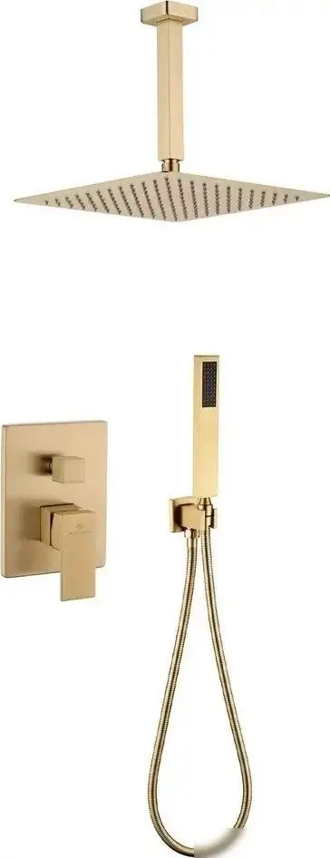 Душевая система Grocenberg GB5089MG-4 выполнена в элегантном матовом золотом цвете и подходит для скрытого монтажа. В комплект входит верхний душ с прямоугольной формой и диаметром 300 мм, а также фиксированный ручной душ в круглой форме диаметром 35 мм. Верхний душ имеет один режим работы и фиксируется на месте, а ручной душ — тоже с одним режимом, его удобно использовать для направления воды туда, куда нужно. Все элементы сделаны из качественной латуни и металла, что гарантирует долговечность. В системе отсутствует смеситель или вентиль, управление водой осуществляется отдельно. Шланг длиной 1500 мм позволяет легко дотянуться до нужных участков тела. Общий вес системы — около 6 кг, что обеспечивает стабильность и надежность. Эта система легко монтируется благодаря скрытому монтажу и станет стильным дополнением ванной комнаты.