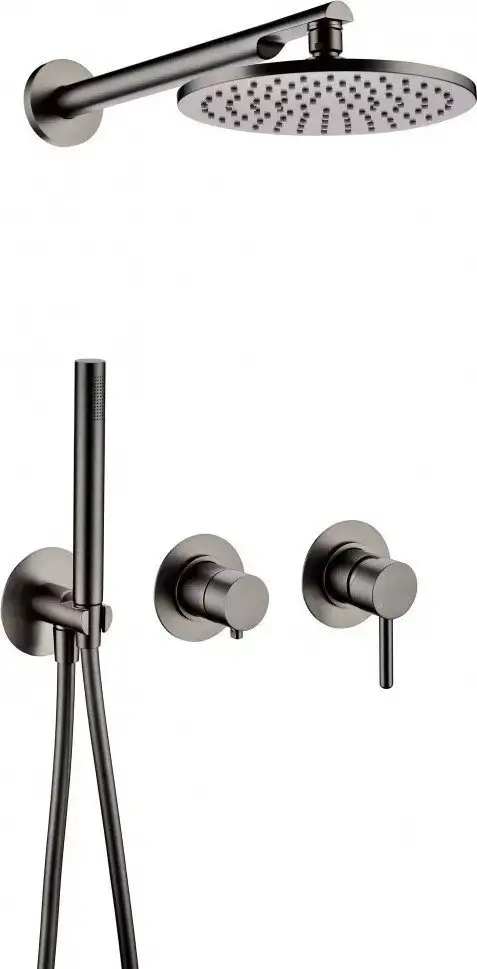 Душевая система Grocenberg GB5090 в сером цвете создана для комфортного принятия душа. Она оснащена верхним и ручным душем, оба имеют круглую форму и по одному режиму работы. Верхний душ фиксируется и имеет диаметр 200 мм, что обеспечивает широкое освещение поблизости. Ручной душ диаметром 30 мм также фиксированный и удобный в использовании. В комплект входит шланг длиной 1500 мм, что дает свободу движений под душем. Сделана из прочных материалов — латунь для душа и металл для шланга, что гарантирует долговечность. Монтаж системы скрытый, что создает аккуратный внешний вид. Имеет стильный графитовый цвет, легко впишется в современный интерьер. Вес системы составляет 6 кг, она устойчива и удобна в установке. Обратите внимание, что смеситель и вентиль в комплекте отсутствуют.