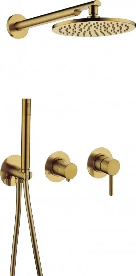 Душевая система Grocenberg GB5090 выполнена в стильном золотом цвете с матовой обработкой. Она включает верхний и ручной душ, оба с одним режимом, оба с круглой формой и подходящими размерами — 200 мм и 30 мм соответственно. Устройство изготовлено из прочной латуни и металла, что обеспечивает долговечность и надежность. Монтаж системы скрытый, что создает аккуратный внешний вид в ванной. В комплект входит шланг длиной 1500 мм, облегчающий использование душа. Благодаря простому дизайну и качественным материалам, душ обеспечивает комфортное использование и долгий срок службы. Электронных элементов или смесителя в системе нет, что упрощает уход. Устройство идеально подойдет для тех, кто ценит современный стиль и практичность в ванной комнате.