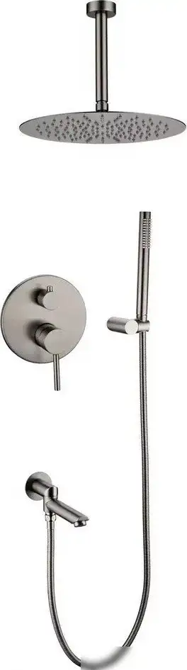 Душевая система Grocenberg GB5099BG-2 выполнена в стильном графитовом цвете и подходит для скрытого монтажа. Она состоит из верхнего и ручного душа, оба с круглыми формами и диаметрами 300 мм и 25 мм соответственно. Верхний душ фиксирован и имеет один режим, что обеспечивает приятный поток воды для комфортного мытья. Ручной душ также фиксированный и удобно управляется, шланг длиной 150 мм облегчает движение. Латунный материал корпуса и металлический шланг делают систему прочной и долговечной. В комплект входит верхний душ, ручной душ и шланг. Размеры системы — примерно 390 мм в глубину, весит около 6 кг. Установка осуществляется с помощью скрытого монтажа, что создает аккуратный внешний вид. Ее простое управление и надежность делают душевую систему отличным выбором для современного дома.
