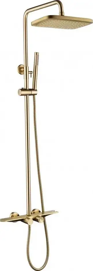 Душевая система Grocenberg GB7038 выполнена в элегантном матовом золоте и предназначена для настенного монтажа. Она включает верхний фиксированный душ с прямоугольной формой и диаметром 300 мм, а также ручной душ с шириной 25 мм. Верхний душ обеспечивает один режим работы и фиксированную форму, а длина штанги и шланга составляет 1500 мм, что дает свободу движений. В системе установлен термостатический смеситель и вентиль, что помогает поддерживать комфортную температуру воды. Материалы корпуса — латунь для душа и металл для шланга — обеспечивают долговечность. Вылет верхнего душа 50 мм позволяет удобно пользоваться им без лишних усилий. Эта система сочетает стиль и функциональность, легко монтируется и сбалансирует поток воды. Он подходит для тех, кто ценит надежность и красивый дизайн в ванной комнате. Точное исполнение и высокое качество материалов делают ее отличным выбором для современного интерьера.