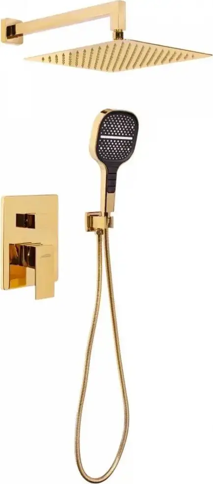 Душевая система Hansberge H6070 выполнена в стильном золотом глянце и обладает современным дизайном. Она включает в себя верхний и ручной душ, оба с четырьмя режимами работы для комфортного использования. Верхний душ имеет прямоугольную форму и диаметр 300 мм, что обеспечивает равномерное распределение воды. Ручной душ также прямоугольный и диаметром 130 мм легко регулируется для удобства. Все элементы сделаны из качественной латуни и металла, что гарантирует долговечность. Вода подается через скрытую монтажную систему, что делает установку проще и аккуратнее. Шланг длиной 1,5 метра позволяет легко управлять ручным душем. В комплект входит все необходимое для монтажа, а вес системы составляет всего 6 кг. Эта система отлично подойдет для современного санузла с эстетичным видом и надежной работой.
