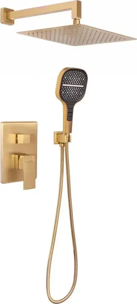 Душевая система Hansberge H6070 в стильном матовом золоте выглядит современно и легко сочетается с разной ванной. Она включает верхний и ручной душ, оба с фиксированными режимами и прямоугольной формой, что обеспечивает комфортное использование. Верхний душ имеет диаметр 300 мм и предлагает 4 режима работы, чтобы выбрать оптимальную струю воды. Ручной душ шириной 130 мм тоже имеет 4 режима, что делает мытьё более удобным. Шланг длиной 1500 мм позволяет легко доносить воду до различных участков. Конструкция скрытого монтажа сохраняет аккуратный вид в ванной. Души выполнены из латуни и металла, что обеспечивает долгий срок службы. В комплекте нет смесителя или вентиля, эти элементы нужно приобретать отдельно. Размеры системы — 300x300 мм, вес — 6 кг, что обеспечивает стабильность и удобство установки.