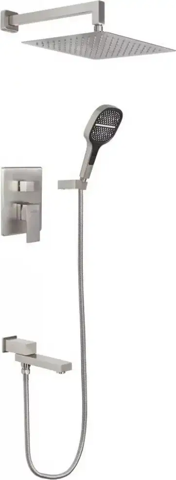Душевая система Hansberge H6075 в никелевом цвете сочетает в себе практичность и стиль. Она оснащена верхним душем с четырьмя режимами и фиксированной рамкой, а его размеры 300 мм позволяют отлично покрывать всю площадь. Ручной душ также имеет четыре режима, его форма и диаметр 130 мм делают его удобным в использовании. Шланг длиной 1500 мм обеспечивает свободу движений и комфорт при мытье. Конструкция выполнена из прочных материалов: латунь, металл и пластик, что обеспечивает долговечность. Монтаж системы скрытый, а суммарный вес — всего 6 кг, что облегчает установку. В системе отсутствует смеситель или вентиль, поэтому управление осуществляется изливом и душами. Весь комплект включает верхний и ручной душ, а также шланг, что делает её ready к использованию сразу после монтажа.