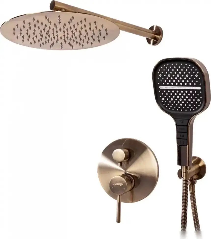 Душевая система Hansberge H6090 выполнена в стиле бронза и подходит для скрытого монтажа. Она включает верхний душ диаметром 300 мм с четырьмя режимами и фиксированной формой, а также ручной душ прямоугольной формы с четырьмя режимами и диаметром 130 мм. Все части сделаны из прочных материалов — латунь, металл и пластик, что обеспечивает долгий срок службы. В комплект входит держатель лейки и шланг длиной 1500 мм, что позволяет легко регулировать направление воды. Конструкция без смесителя или вентиля исключает лишние детали, делая систему простее в использовании. Верхний и ручной душ легко совмещают в одной системе для комфортного пользования. Монтаж системы скрытый, что создает аккуратный и современный внешний вид в вашей ванной комнате.