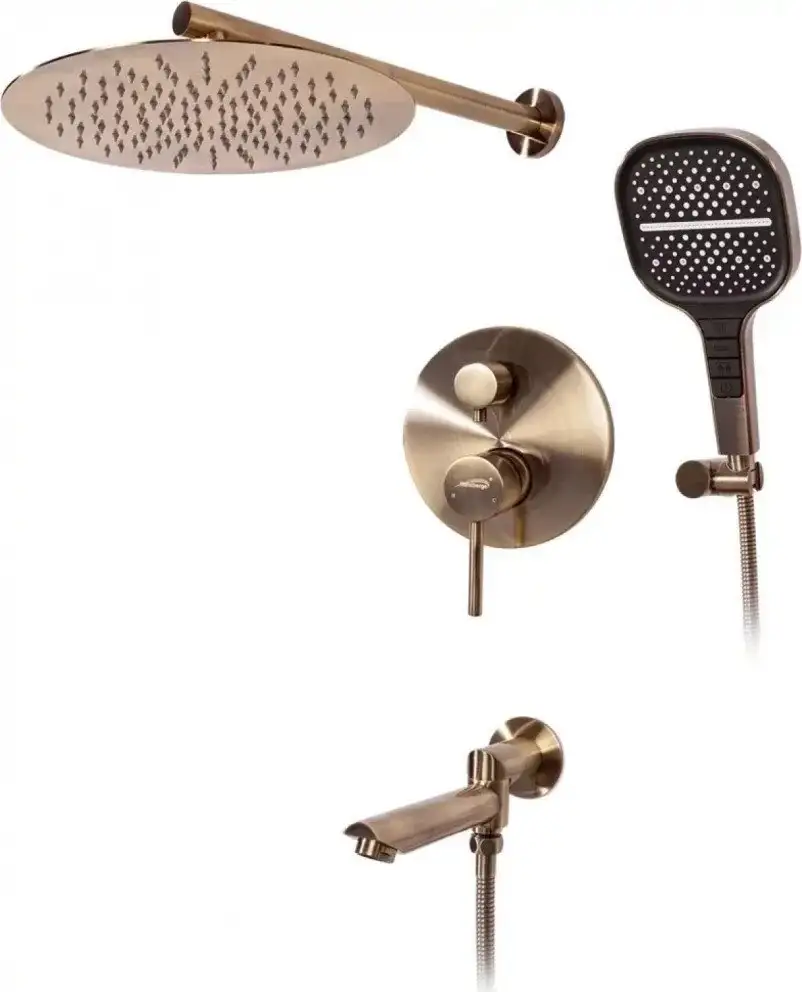 Душевая система Hansberge H6095 в бронзовом цвете создаст уют в вашей ванной. Она оснащена верхним душем с четырьмя режимами, который обеспечивает равномерное и комфортное водоснабжение. Верхний душ имеет диаметр 300 мм и круглую форму, что делает его удобным и стильным. В комплекте есть ручной душ с четырьмя режимами, прямоугольной формы и диаметром 130 мм для удобства использования. Шланг длиной 1500 мм позволяет свободно регулировать положение душа. Вся система выполнена из прочных материалов — латунь для душа и металл для шланга. Монтаж осуществляется скрытым способом, что делает установку аккуратной и незаметной. Конструкция не включает смеситель или вентиль, а излив уже есть. Общий вес системы — около 6 кг, что обеспечивает стабильность и надежность. Благодаря качественным материалам и простой конструкции, эта система прослужит долго и легко в уходе.