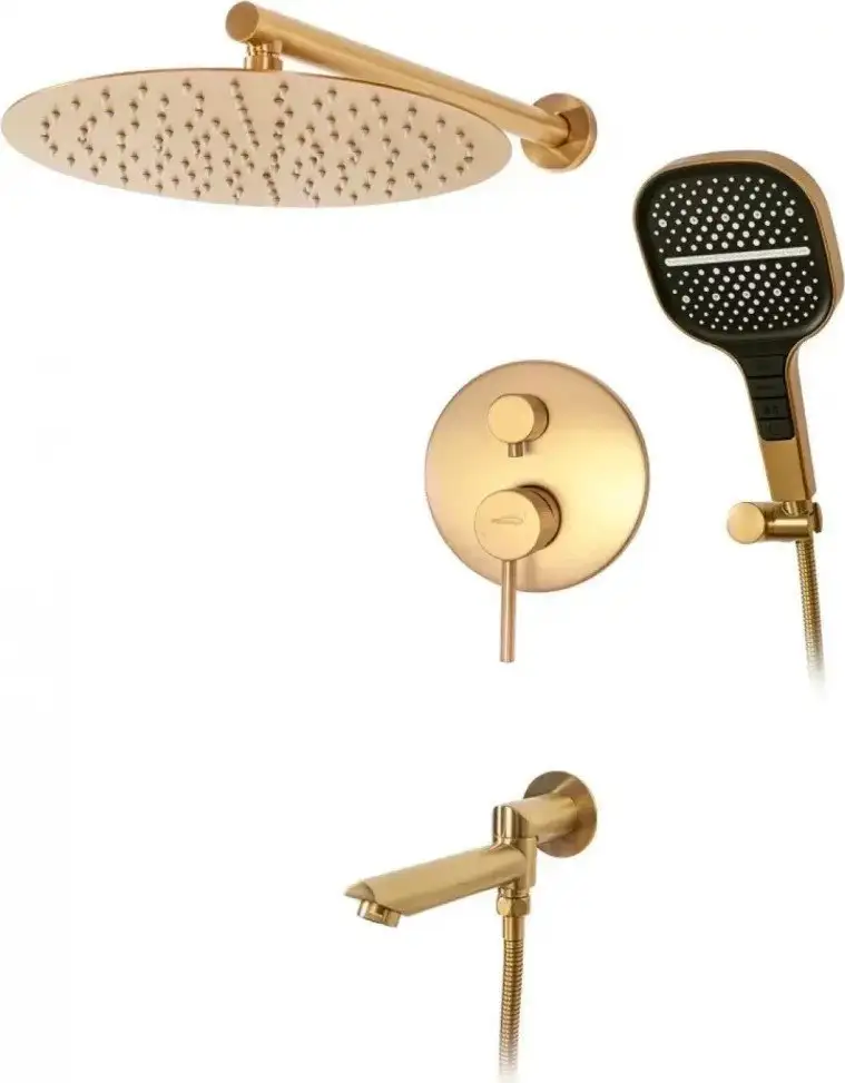 Душевая система Hansberge H6095 в красивом матовом золоте создаст современный и стильный вид вашей ванной. Она включает в себя фиксированный верхний душ диаметром 300 мм и ручной душ с четырьмя режимами, что позволяет легко менять настройку водяного потока. Верхний душ имеет круглую форму, а ручной — прямоугольную, что делает использование более комфортным. Качественные материалы, такие как латунь и металл, обеспечивают прочность и долговечность. Шланг длиной 1500 мм помогает удобно дотянуться до любых участков ванны или душевой кабины. Устройство монтируется скрытым способом, что придает аккуратный внешний вид. В комплект входит всё необходимое: верхний и ручной души, а также шланг. У системы отсутствует смеситель или вентиль, что упрощает ее использование. Общий вес изделия составляет 6 кг, что делает его достаточно легким и удобным для установки.