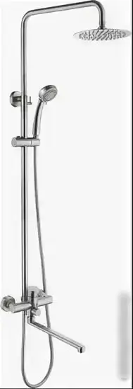 Душевая система Ledeme L72403-2 выполнена из прочного металла с хромовым покрытием, что делает её долговечной и легко чистящейся. Она устанавливается на стену и включает в себя верхний и ручной душ, оба круглой формы, с диаметрами 200 мм и 78 мм соответственно. Верхний душ имеет один режим работы и крепится на шарнире, что позволяет регулировать его положение. Ручной душ фиксированный и удобно держится в руке, шириной 78 мм. В системе есть излив для ванны, что удобно для комбинированных решений.