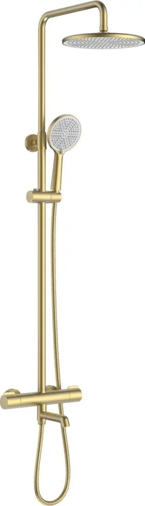 Душевая система Raglo R20.26.03 сочетает в себе стильный дизайн и удобство использования. Она выполнена из латуні, что обеспечивает долговечность и надежность. Устройство устанавливается на стену и включает термостатический смеситель, который автоматически поддерживает заданную температуру воды. Верхний душ имеет диаметр 250 мм и регулируется на шарнире, что позволяет менять направление струи. В комплект входит ручной душ с регулировкой по высоте, шланг, держатель и излив для ванны. Красивая золотая отделка делает систему подходящей для современного интерьера. Прочное штанговое крепление длиной 1030 мм и общее вылет 370 мм обеспечивают комфортный монтаж и использование. Несколько режимов верхнего душа позволяют выбрать оптимальный поток для каждого пользователя.