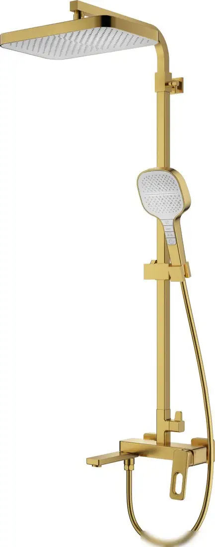 Душевая система Raglo R51.24.03 предназначена для установки на стену и включает верхний душ с одним режимом работы и ручной душ, который можно регулировать по высоте. Основой для изготовления является прочный латунь, а вся конструкция выполнена в золотом цвете, что придает ей элегантный вид. В комплект входит все необходимое: штанга, держатель, шланг, смеситель и излив для ванны. Верхний душ имеет прямоугольную форму и диаметр 330 мм, что обеспечивает широкую потоковую зону.