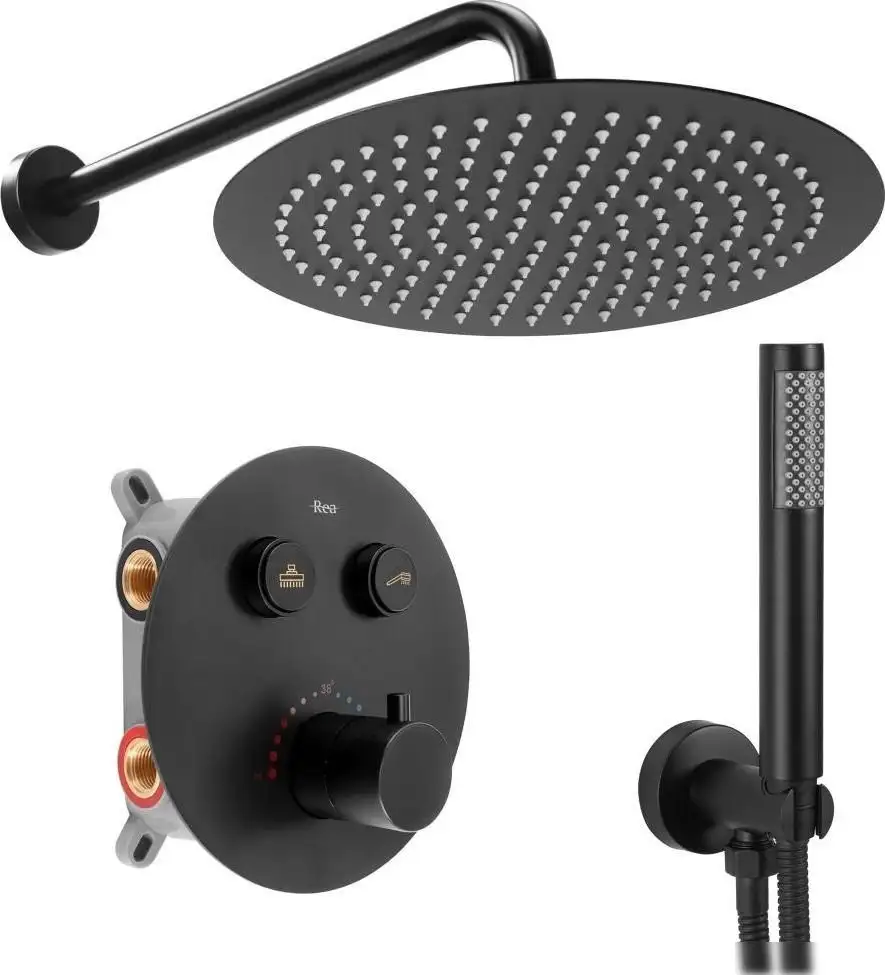 Душевая система Rea Lungo REA-P8549 автоматически обеспечивает комфортное использование с верхним и ручным душем. Она выполнена из прочных пластиковых и латунных материалов, что гарантирует долговечность и надежность. Устройство монтируется на стену и скрыто, что помогает сохранять чистоту и эстетику ванной комнаты. Термостатический смеситель регулирует температуру воды и поддерживает её стабильно. Верхний душ имеет круглую фиксированную насадку, которая равномерно распределяет поток. Ручной душ с держателем легко регулируется для комфортного использования. В комплект входят шланг, держатель для лейки и монтажные элементы. Цвет системы — антрацит, что отлично сочетается с современным интерьером. Эта система проста в использовании и долговечна, а отсутствие ограничений расхода воды позволяет адаптировать использование под ваши нужды.
