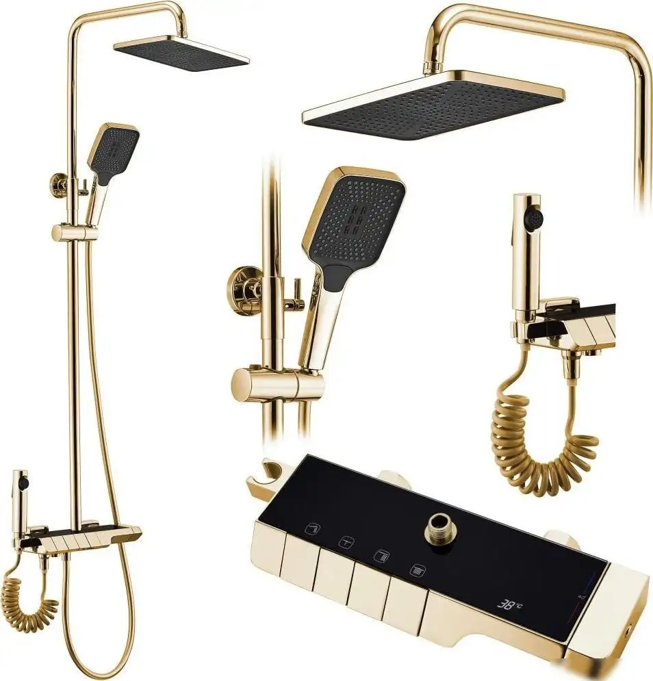 Душевая система Rea Rob REA-P6625 выполнена из пластика и латуни, что обеспечивает долговечность и надежность. Она включает верхний фиксированный душ с прямоугольной формой и ручной душе с регулируемой высотой, что позволяет выбрать оптимальный поток воды. В комплект входит шланг, держатель, смеситель и излив для ванны, а также гигиенический душ для дополнительного комфорта. Устройство монтируется настенным способом и имеет стильный золотой цвет, придающий интерьеру элегантность. Благодаря термостатическому вентилю, система поддерживает стабильную температуру воды, исключая риск обжечься. Верхний душ обладает широкой площадью, равномерно распределяя воду по телу. Также есть обратный клапан, предотвращающий обратный ток воды и обеззараживание системы. Размеры системы позволяют регулировать длину в диапазоне 850–1150 мм, что делает установку удобной и универсальной.