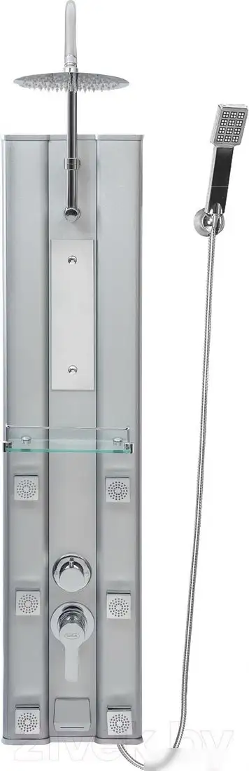 | Комплектация | верхний душ, ручной душ (лейка), шланг, смеситель, мыльница или держатель для мыла, полочка, зеркало |