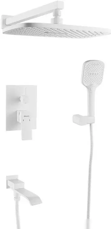 Душевая система Shevanik S4035C включает верхний и ручной душ, оба с прямоугольной формой и разными режимами. Верхний душ диаметром 320 мм имеет три режима, а ручной — 210 мм, тоже с тремя режимами, что позволяет выбрать наиболее комфортный поток воды. Все элементы сделаны из пластика, металла и латуни, что обеспечивает долгую работу и надежность. В системе есть излив для ванны и каскадный излив, что удобно при использовании в ванной. Монтаж производят настенным способом с спрятанной установкой, что делает внешний вид более аккуратным. Смеситель и вентиль работают механически, без электронных компонентов, что упрощает их обслуживание. Длина шланга 1500 мм позволяет легко мыть и перемещать лейку. В системе нет ограничения расхода воды и температуры, что дает больше свободы в использовании. Вся система выполнена в белом цвете, что хорошо вписывается в современный интерьер.