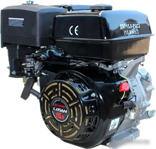 Бензиновый двигатель Lifan 190FD имеет мощность 15 лошадиных сил и подходит для различных задач. Он работает на бензине и оснащён одним цилиндром с объёмом 420 см³. Этот двигатель — четырёхтактный, что обеспечивает его надёжность и экономию топлива. Максимальный крутящий момент составляет 25 Нм, что помогает эффективно справляться с нагрузками. У двигателя есть как ручной, так и электростартер для удобства запуска. Он охлаждается воздушным способом, что упрощает обслуживание.