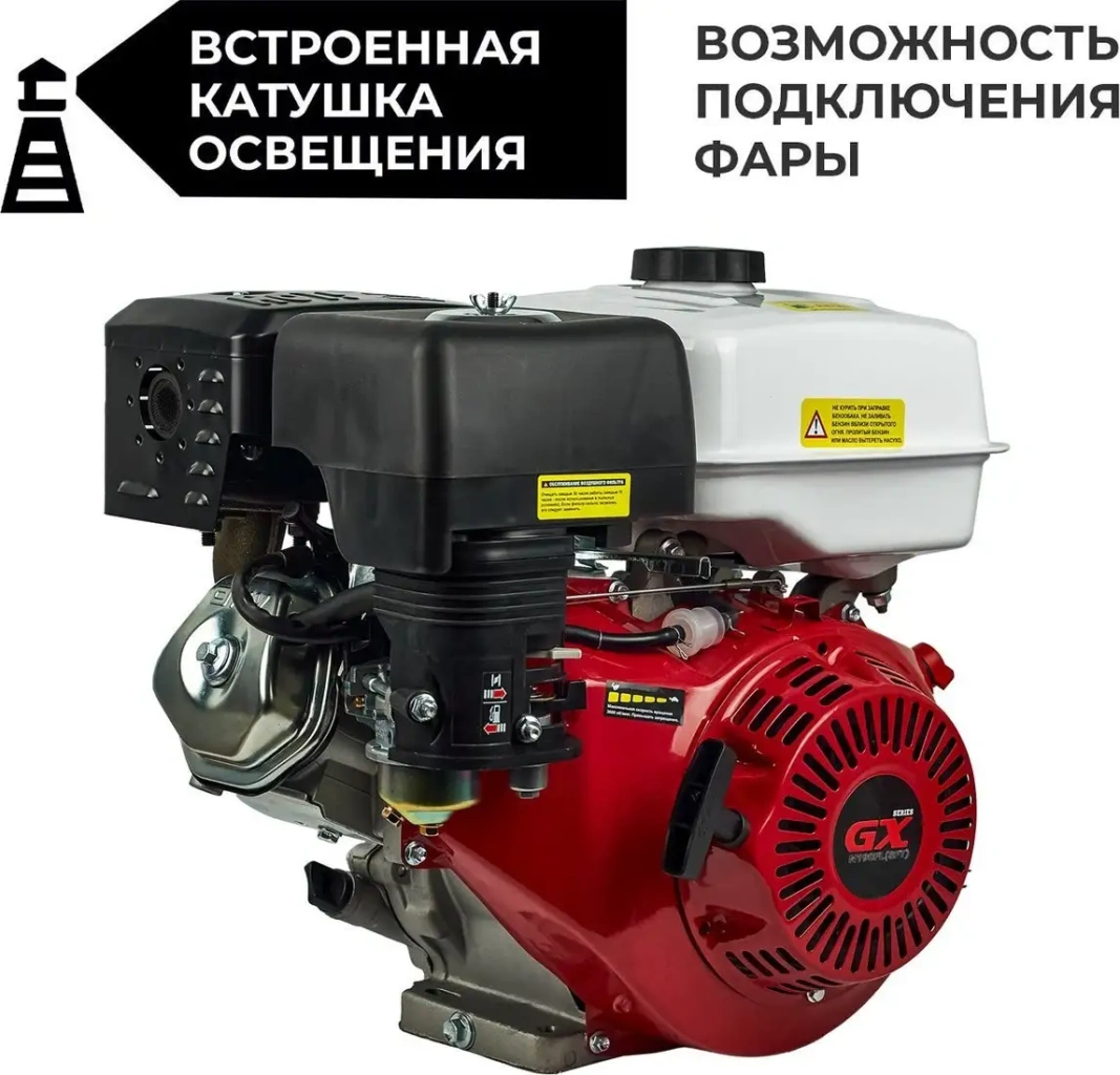 Бензиновый двигатель Skiper SN190FL(SFT) произведён в Китае и оснащён однолитровым четырёхтактным мотором мощностью 16 л.с. Он имеет один цилиндр и достигает максимального крутящего момента в 28 Нм, что обеспечивает хорошую производительность. Рабочий объём двигателя составляет 407 см³, а емкость топливного бака — 6,5 литров — позволяет надолго работать без дозаправки. Воздушное охлаждение двигателя помогает поддерживать оптимальную температуру и продлевает его срок службы. Для запуска используется ручной стартер, что делает эксплуатацию удобной и надёжной. Выходной вал — шлицевой, диаметром 25 мм, подходит для подключения различного оборудования. Удельный расход топлива составляет 525 г/кВт*ч, что помогает планировать эксплуатацию и экономию топлива.