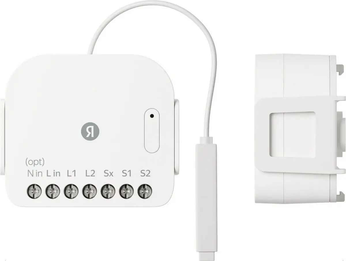 | Комплектация | Умное реле Яндекса, двухканальное Комплект проводов для подключения выключателя Крепление на DIN?рейку Инструкция Документ |