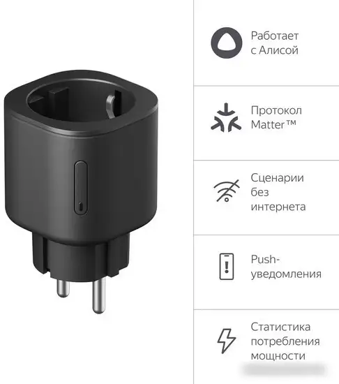 подключение к Wi-Fi, соединение Matter, управление через Яндекс Алиса, размещение внутри помещения, питание: сеть 220В, световой индикатор/мониторинг электроэнергии
