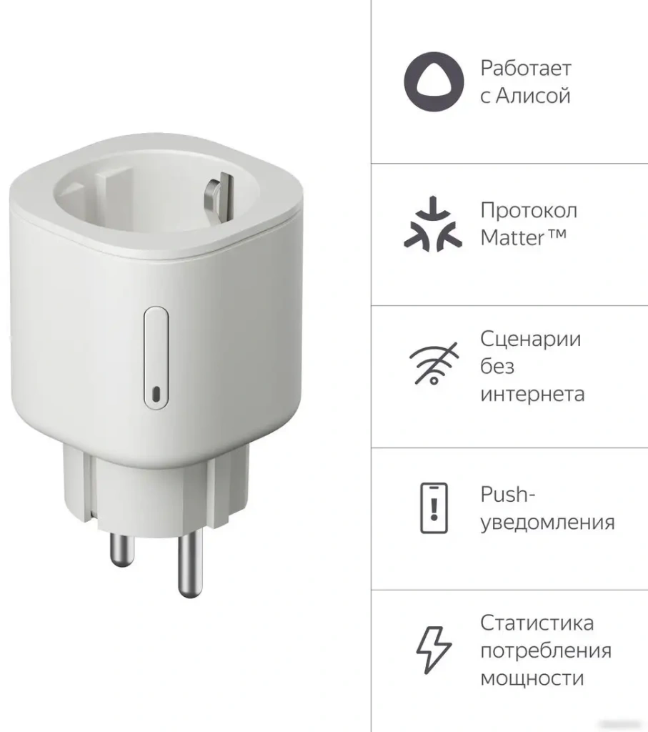 подключение к Wi-Fi, соединение Matter, управление через Яндекс Алиса, размещение внутри помещения, питание: сеть 220В, световой индикатор/мониторинг электроэнергии