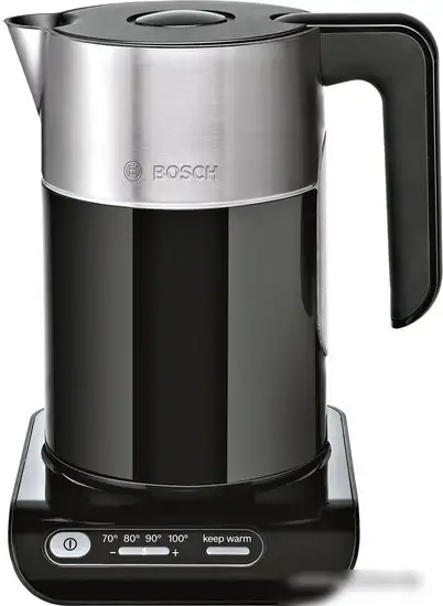Чайник Bosch TWK8613P выполнен из высококачественного пластика и корпуса из нержавеющей стали, что делает его стильным и долговечным. Он обладает мощностью 2 400 Вт и объемом 1,5 литра, что позволяет быстро вскипятить воду. На корпусе есть прозрачная вставка и индикатор уровня воды, чтобы удобно следить за количеством закипятой воды. Электронное управление позволяет легко выбрать нужную температуру из четырех вариантов: 70°C, 80°C, 90°C и 100°C. Индикация закипания и поддержание температуры до 30 минут помогают готовить напитки по вашему вкусу. Подставка вращается, что делает использование более удобным. Устройство имеет закрытый нагревательный элемент для безопасной эксплуатации и минимального шума.