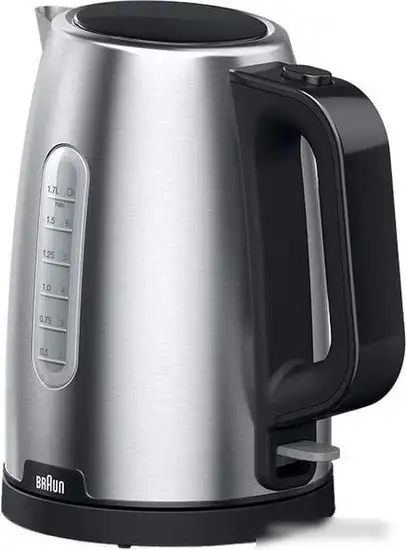 Электрический чайник Braun WK1500BK выполнен из прочной нержавеющей стали и обладает мощностью 2200 Вт, что позволяет быстро вскипятить воду. Он имеет объем 1,7 литра и обеспечивает точный уровень воды по бокам для удобства наливания. Минимальный уровень воды составляет 0,3 литра, что помогает избежать пересыхания устройства. Чайник оснащён вращающейся подставкой для лёгкой установки и снятия. Его управление механическое, что делает его простым в использовании без необходимости настройки через смартфон. За счёт закрытого нагревательного элемента он безопасно кипятит воду и долго сохраняет её температуру. Корпус выполнен из нержавеющей стали и покрыт чёрной стойкой к царапинам, что обеспечивает долговечность и современный внешний вид. Встроенная индикация уровня воды по бокам позволяет легко следить за количеством воды, а отсутствие подсветки воды делает устройство более простым в обслуживании. Этот чайник отлично подходит для быстрой и безопасной подготовки горячей воды дома или в офисе.