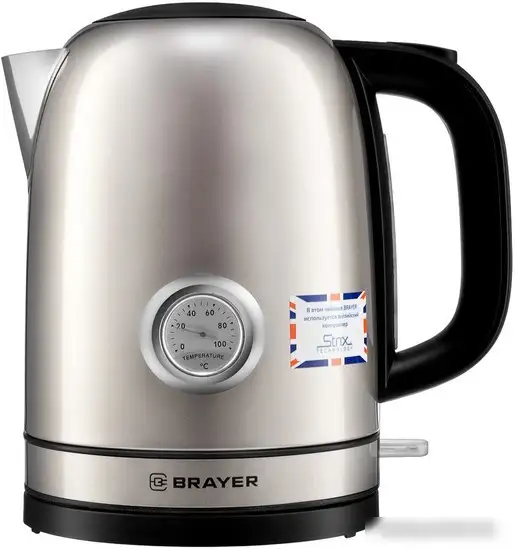 Электрический чайник Brayer BR1050 выполнен из нержавеющей стали и имеет мощность 2200 Вт, что позволяет быстро вскипятить воду. Его объем составляет 1,7 литра, а минимальный уровень воды — 0,7 литра. Чайник удобно управляется механической кнопкой и вращающейся на 360° подставкой. На корпусе есть наружный уровень воды, что облегчает контроль за количеством жидкости. Внутренний индикатор показывает реальную температуру воды, что помогает следить за процессом. Особенно удобно то, что чайник защищает от несправедливого закипания и отличается надежностью и долговечностью.