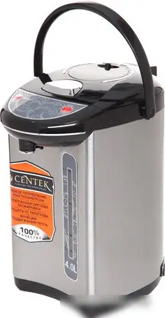 Чайник CENTEK CT-1082 выполнен из нержавеющей стали и отличается прочностью и долговечностью. Он имеет объём 4 литра, что удобно для семейных и офисных мероприятий. Мощность устройства составляет 750 Вт, поэтому вода быстро закипает. В чайнике есть возможность поддерживать температуру воды, что удобно для приготовления горячих напитков в течение дня. Конструкция оснащена вращающейся подставкой и прозрачной вставкой спереди, которая показывает уровень воды. Для процесса наливания используем электрический насос, механическую помпу или нажимающийся клапан, что обеспечивает комфорт и простоту использования. Также он оснащен функцией длительного кипячения, что позволяет максимально эффективно подготовить воду для различных нужд.