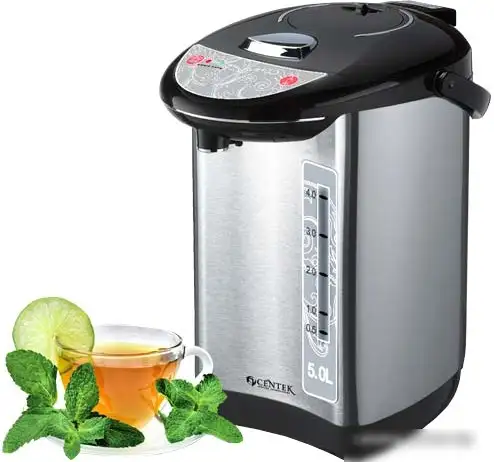 Чайник CENTEK CT-1083 изготовлен из нержавеющей стали и обладает объемом 5 литров, что идеально подходит для большой семьи или офиса. Мощность устройства — 750 Вт, оно быстро нагреет воду и легко справляется с задачей. Конструкция позволяет вращать подставку, что удобно в использовании. Чайник имеет прозрачную вставку спереди для контроля уровня воды, а также защищённый нагревательный элемент, что повышает безопасность эксплуатации. Он поддерживает воду горячей длительное время и оснащён механической помпой для удобного разлива.