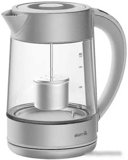 Электрочайник Deerma DEM-SH50W имеет мощность 2200 Вт и объем 1.7 литра, что позволяет быстро вскипятить воду. Корпус сделан из металла и стекла, он выглядит современно и прочен. Колба стеклянная, легко контролировать уровень воды по бокам и видеть процесс нагрева. В чајнике есть функция поддержания температуры до 120 минут, что удобно для сохранения горячей воды. Терморегулятор с диапазоном 40-100°C и индикатор температуры помогают выбрать нужную температуру. Он оснащен вращающейся на 360° подставкой для удобства установки и использования. Минимальный уровень воды — 0,5 литра, что позволяет включать устройство даже при небольшом количестве воды. Электронное управление делает работу простым и точным. В устройстве есть закрытый нагревательный элемент для безопасности и долговечности. Внешний уровень воды помогает контролировать запас воды без открытия крышки.