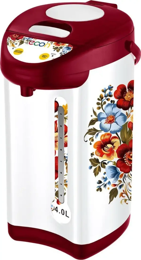 Термопот Econ ECO-405TP работает от электросети с мощностью 750 Вт и имеет объем 4 литра, что позволяет за раз налить много горячей воды. Он изготовлен из металла и пластика, корпус доступен в белом, красном или с ярким принтом цвете. Устройство оснащено вращающейся подставкой и спереди показывает уровень воды, что облегчает заправку. Термопот поддерживает воду горячей длительное время и позволяет кипятить ее повторно. Для розлива воды используют электросос или механическую помпу, что делает процесс удобнее. Он управляется электронным управлением без необходимости подключаться к смартфону или умному дому. В конструкции предусмотрен закрытый нагревательный элемент, это обеспечивает безопасность и долгий срок службы. Также есть возможность выбрать удобный способ розлива и поддерживать нужную температуру воды для горячего напитка.