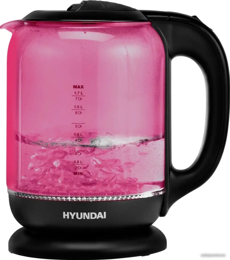 Электрический чайник Hyundai HYK-G4808 выполнен из прочных материалов — стекла и пластика, что придаёт ему современный и стильный вид. Он обладает мощностью 2200 Вт и ёмкостью 1,7 литра, что позволяет быстро вскипятить воду для вашего напитка. Встроена подсветка воды, которая показывает уровень снаружи, а по бокам есть отметки для точного дозирования воды. Чайник легко управляется механической ручкой и вращается на 360°, что удобно при использовании. Его небольшие размеры и вес всего около 950 г делают устройство удобным для хранения и переноски. Благодаря внешнему уровню воды и автоматической защите от перегрева, он обеспечивает безопасность и комфорт в использовании. Другие функции, такие как поддержание температуры или возможность длительного кипячения, в устройстве отсутствуют, что упрощает его использование. Его дизайн сочетает розовый и чёрный цвета, что делает его подходящим для современной кухни. Этот чайник отлично подходит для быстрого нагрева воды, благодаря своему мощному нагревательному элементу и современным характеристикам.