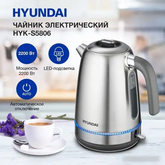 Электрический чайник Hyundai HYK-S5806 имеет мощность 2200 Вт и объем 1,7 литра, что позволяет быстро вскипятить воду. Его корпус сделан из металла, а внутренняя колба — из нержавеющей стали, что обеспечивает долговечность и легкую очистку. Чайник оснащен вращающейся на 360° подставкой и индикатором уровня воды вблизи ручки для удобства использования. Внутренний уровень воды подсвечен синей подсветкой, что помогает контролировать количество воды. Минимальный уровень воды составляет 0,5 литра, что пригодится для безопасной эксплуатации. Управляется устройство механически, что делает его простым в использовании и обслуживании. Если нужно, можно легко видеть внешний уровень воды прямо возле ручки. Чайник не поддерживает температуру или длительное кипячение, он предназначен только для быстрого нагрева воды. Такой дизайн и функции подходят для ежедневного использования дома или в офисе, обеспечивая быстрый и безопасный нагрев воды без лишних функций.