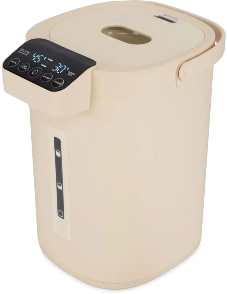 Термопот Hyundai HYTP-3144 выполнен из пластика с внутренней колбой из нержавеющей стали, что обеспечивает долговечность и безопасность. Он имеет объем 5,2 литра и мощность 1600 Вт, быстро нагревая воду. Благодаря электроспринцу можно удобно наливать воду, не открывая крышку. Термопот поддерживает выбранную температуру от 40°C до 100°C и показывает текущий уровень воды спереди. Сенсорное управление легко использовать, а индикатор температуры помогает контролировать процесс. Устройство легко перемещать с помощью вращающейся подставки на ровной поверхности. Благодаря скрытому нагревательному элементу упрощается очистка. Он не предполагает наличие функций заваривания или остывания чая и кофе. Устройство удобно для офиса или дома благодаря компактным размерам и простоте использования. В комплект не входят чашки, что позволяет выбрать их по своему вкусу.