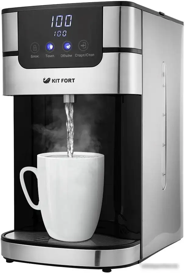 Диспенсер Kitfort KT-2501 выполнен из металла и пластика, что обеспечивает прочность и долгий срок службы. Он имеет объем 4 литра и мощность до 2618 Вт, быстро нагревает воду для приготовления напитков или очистки. Устройство оснащено электромеханическим насосом для удобного розлива воды одним нажатием. На корпусе есть боковые уровнемеры воды, что помогает следить за запасами. Терморегулятор позволяет выбрать температуру воды в диапазоне от 55 до 100°C и контролировать её с помощью индикации. Сенсорное управление делает работу с диспенсером простой и удобной. Благодаря встроенной подсветке и современному дизайну в черном цвете с нержавеющей сталью, он отлично впишется в любой интерьер. Антикоррозийный и легкий в обслуживании, это надежное устройство для дома или офиса.