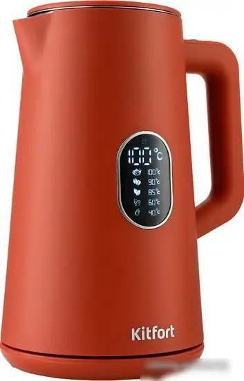 Электрочайник Kitfort KT-6115-3 — это стильный прибор с мощностью 1800 Вт и объемом 1,5 литра. Он выполнен из металла и пластика, а корпус красный, что хорошо смотрится на кухне. Чайник оборудован вращающейся на 360° подставкой и электронным управлением. Он умеет поддерживать выбранную температуру в течение 24 часов, что удобно для долгого сохранения горячего напитка. Есть терморегулятор с пятью режимами нагрева от 40 до 100 °C и индикация температуры для точного контроля. Он легко чистится и компактный — вес всего 1200 г, а длина шнура составляет 0,6 м.