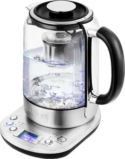 Электрочайник Kitfort KT-6116 — это удобный прибор для приготовления и заваривания чая, который работает на мощности 2200 Вт и имеет объем 1.7 литра. Его корпус сделан из металла и стекла, что придает ему современный и стильный вид, а также обеспечивает долговечность. Чайник оснащен электронной системой управления, которая позволяет точно регулировать температуру и следить за ней через индикатор. Благодаря функции поддержания температуры он сможет сохранять нужный уровень тепла до 30 минут, что удобно для длительного чаепития. В чайнике есть вращающаяся на 360° подставка, что облегчает его использование. Также имеется уровень воды по бокам для быстрой проверки и возможность выбрать нужную температуру из нескольких вариантов (от 40 до 100 °C). Это делает его полезным как для кипячения, так и для заваривания чая разных сортов.