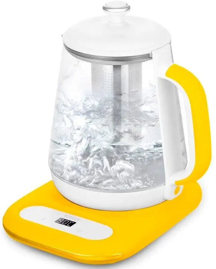 Электрический чайник Kitfort KT-6755 выполнен из прочного пластика и стекла, имеет емкость 1,6 литра и мощность 800 Вт. Он быстро нагревает воду и обеспечивает долгое поддержание температуры до 720 минут благодаря встроенному терморегулятору. Вы можете выбрать один из шести режимов температуры: 45°C, 60°C, 70°C, 80°C, 90°C или 100°C, а наличие индикации показывает текущий уровень нагрева. Устройство управляется электронной панелью, что облегчает настройку и использование. Благодаря вращающейся подставке проще размещать чайник на базе. Его компактные размеры позволяют хранить его в небольших кухонных шкафах или на полке. Чайник не имеет внешней подсветки воды и дополнительных функций для заваривания напитков. Его вес составляет всего 1 кг, что делает его удобным для переноски. Этот чайник идеально подходит для тех, кто ценит быстрый нагрев и контроль температуры воды.