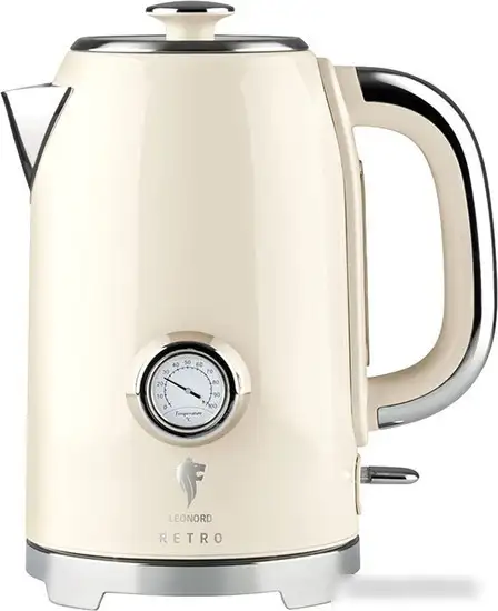 Электрический чайник Leonord Retro LE-1901/2 сочетает стильный бежевый дизайн с прочным металлическим корпусом и нержавеющей сталью внутри. Он обладает мощностью 2200 Вт, что обеспечивает быстрое кипячение воды, и объемом 1.7 литра для приготовления напитков для всей семьи. Чайник оборудован вращающейся подставкой и внешним уровнем воды возле ручки, что делает его использование удобнее. Реальная индикация температуры помогает контролировать процесс нагрева, а механическое управление простое и надежное в использовании. Благодаря компактным размерам — 195 мм в длину и 251 мм в высоту — он легко помещается на любой кухне. Функционально устройство не подерживает поддержание температуры или длительное кипячение, ориентировано только на быстрый нагрев воды. Материал корпуса сочетает металл и пластик, обеспечивая долговечность и эстетичный внешний вид. Этот чайник отлично подойдет для тех, кто ценит стиль и простоту в использовании.